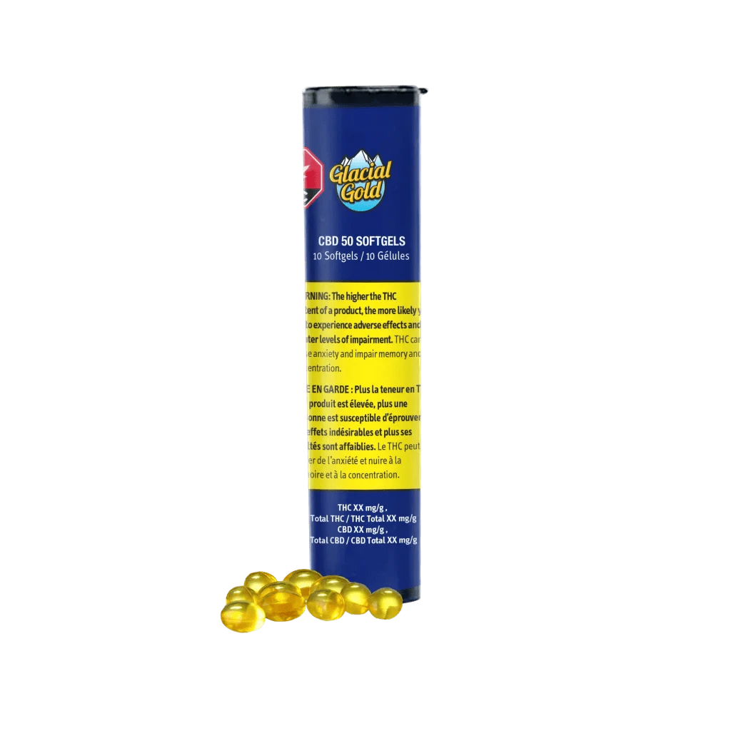 Introducing Glacial Gold CBD 50 Softgels 50-pack containing 2500 mg CBD. Glacial Gold CBD 50 Softgels are made with organic MCT oil from coconuts and high-purity distillates from Nextleaf Labs.