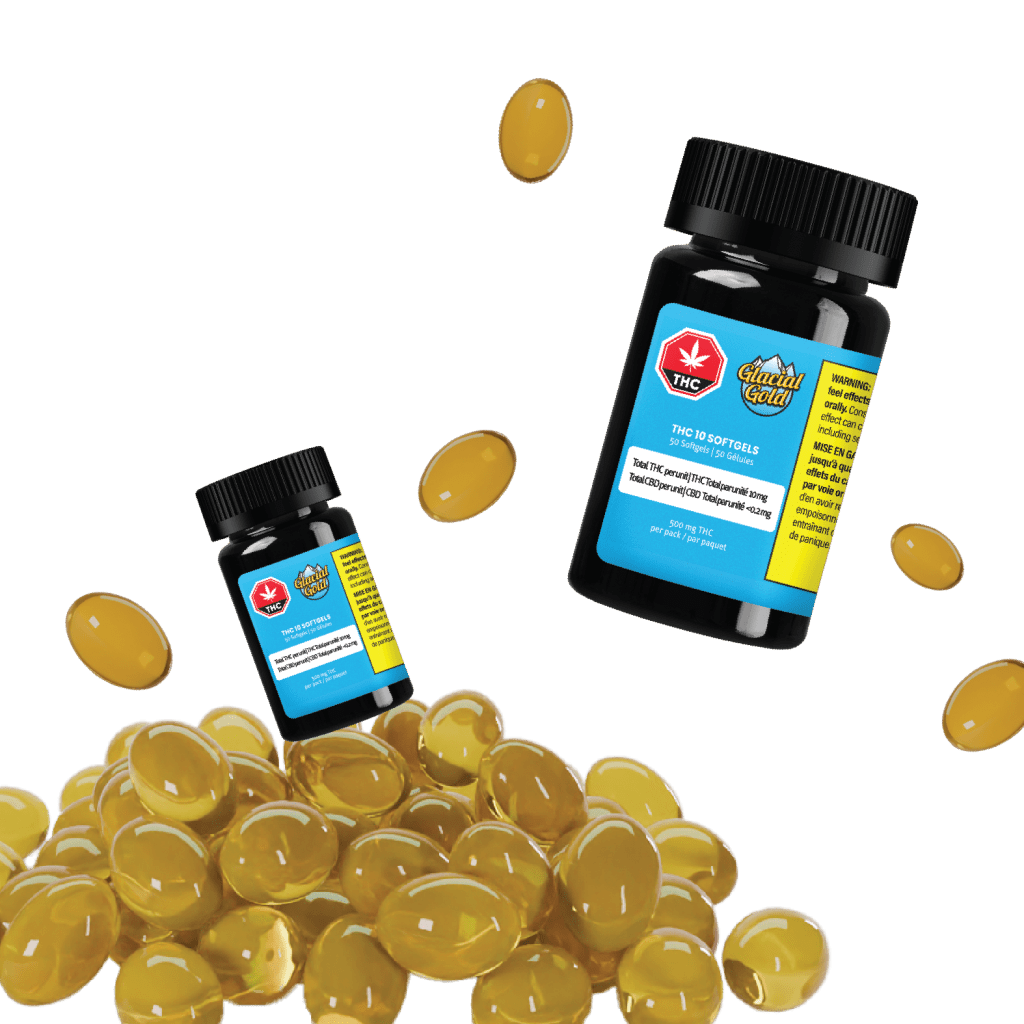 Glacial Gold THC 10 Softgels feature 10mg of THC mixed with organic MCT oil derived from coconuts. Available in a value-size with 50 softgels containing 500mg total THC per bottle.